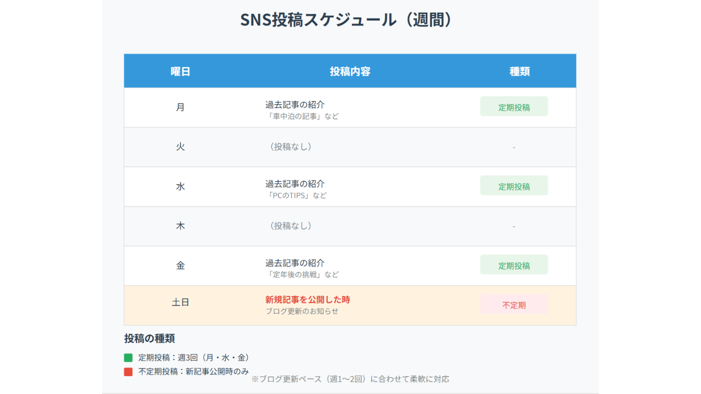 SNS投稿スケジュール表 週3回の定期投稿と新記事時の不定期投稿