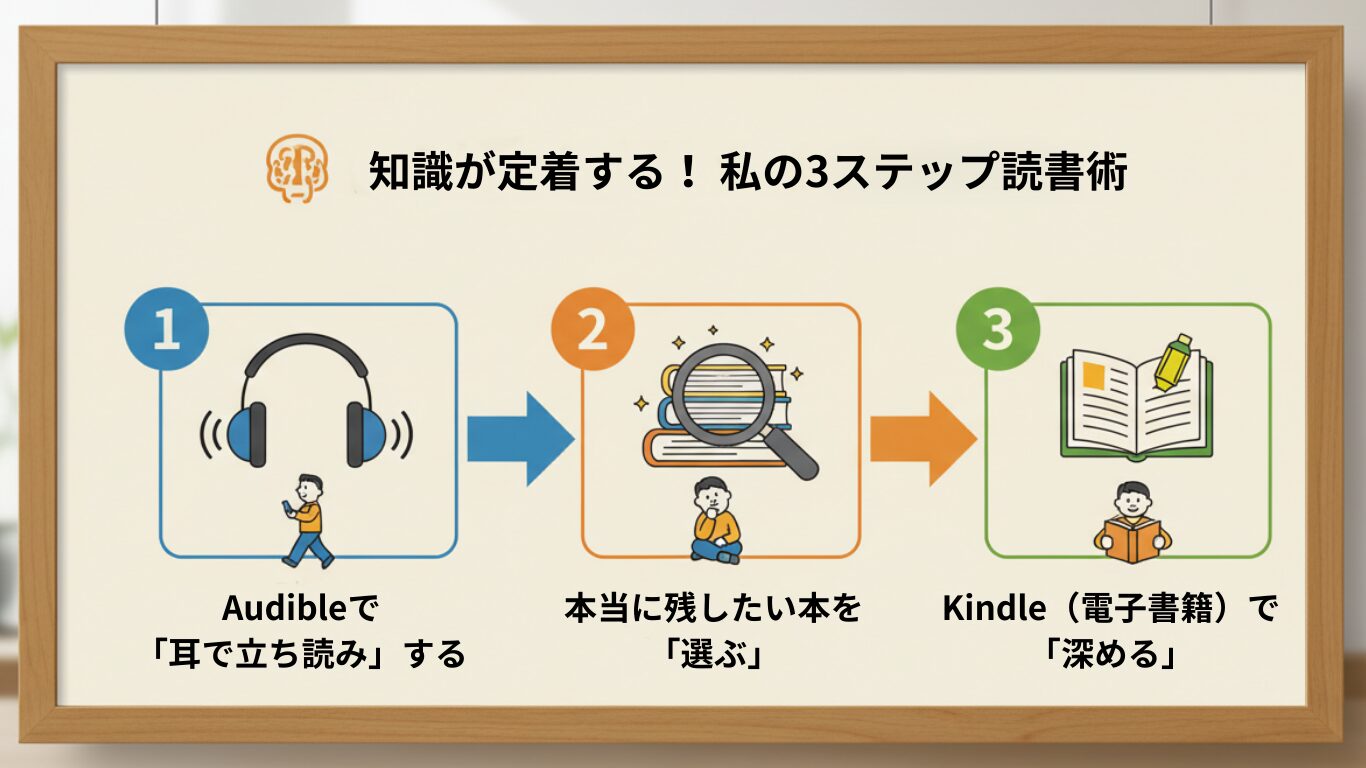 そんなモヤモヤから試行錯誤してたどり着いたのが、今回ご紹介する「Audibleと電子書籍(Kindle)を組み合わせた3ステップ読書術」です。